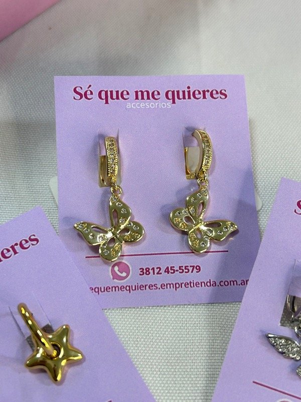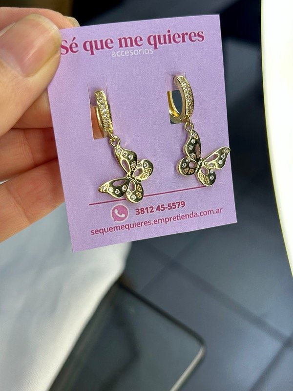Argolla acero dorado con cubic en argolla y mariposa colgando